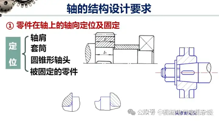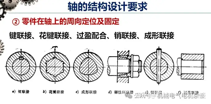 4.1.2 Circumferential positioning of parts on the shaft → no circumferential swing parts are fixed on the shaft in order to transfer torque and prevent parts from rotating relative to the shaft. Commonly used circumferential fixing methods are: key connection, spline connection, interference fit, pin connection, forming connection.