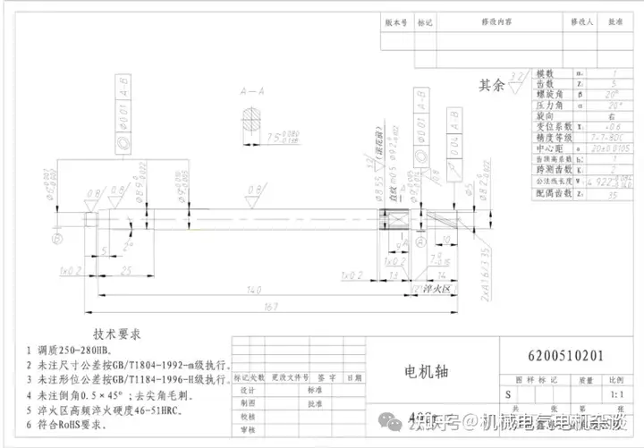 Form and position tolerance: Reference: The bearing neck is used as the reference, and the vertical line of the reference symbol is aligned with the diameter and dimension line. The coaxial degree of the two bearings based on A-B, the tolerance value of 7 grades in the diameter of 0.01 A-B as the basis of the output end of the radial runout, the value is consistent with the above, the rotor journal runout with A-B as the basis, the value is consistent with the above